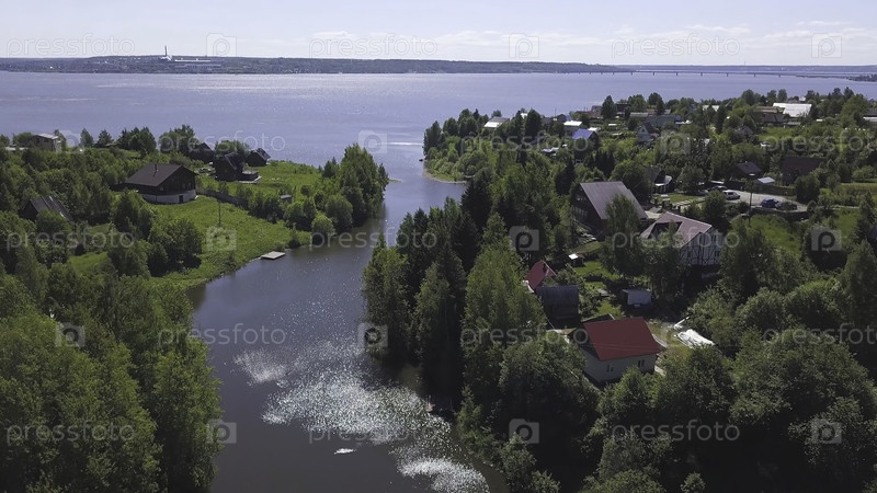 Потрясающий воздушный вид на лесистое побережье с небольшими коттеджами в солнечный летний день.Маленькая прибрежная деревня, красивые дома возле тихого моря