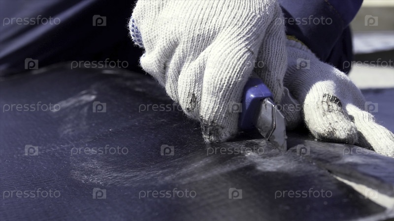 Человек в защитном костюме и перчатках режет кусок рубероида