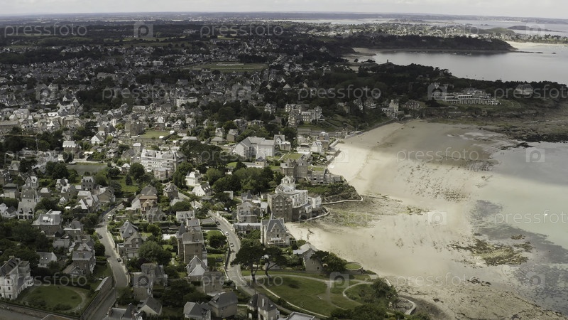 Потрясающий воздушный вид на прибрежный большой город с белыми домами и коттеджами, расположенными недалеко от пляжа