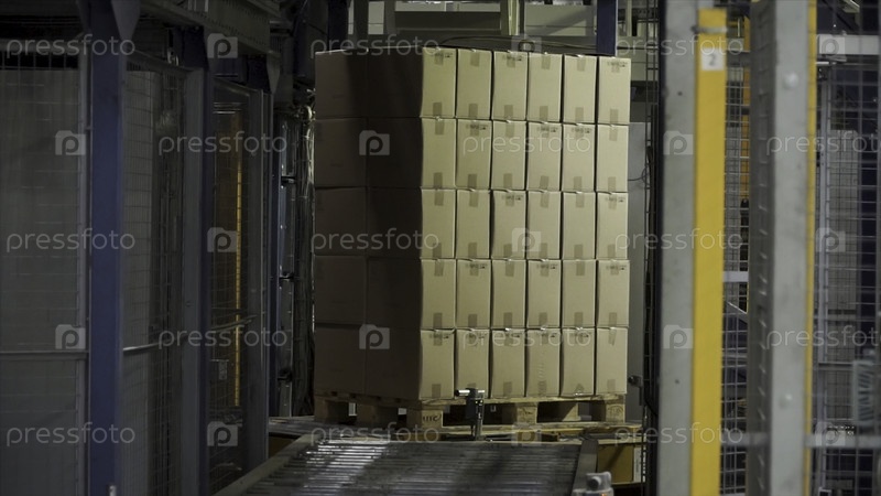 Коробка в движении на конвейере, конец линии. Клип. Перемещение конвейера с картонными коробками по коридору на рабочем месте. Картонные коробки, передвигающиеся на конвейере на заводе