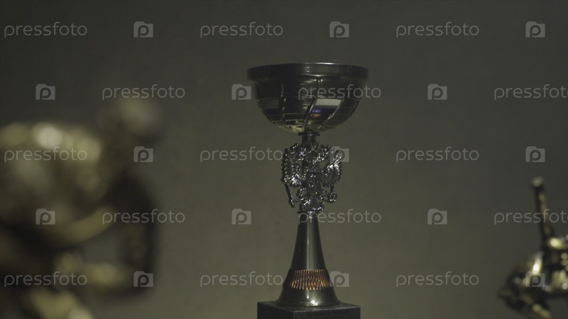 Призовой кубок на сером фоне. Зал славы. Зал славы. Низкий ключ изображение трофея над деревянным столом и темный фон с абстрактными блестящими огнями