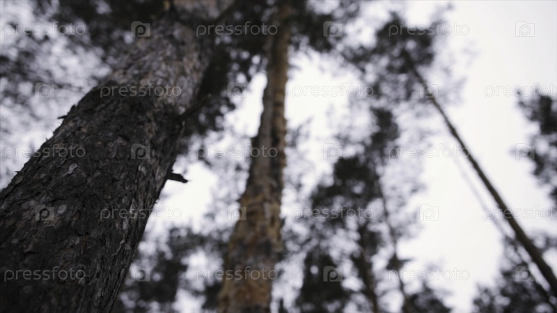 Нижний вид сосновых деревьев на облачном небе. Деревья в лесу. Взгляни, лесное небо. Мягкая размытая фокус