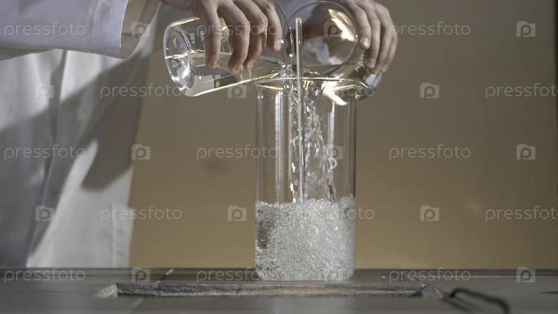 Мужчина-исследователь, проводящий исследования в лаборатории.Промыть жидкостью в лаборатории.жидкость в колбе меняет цвет