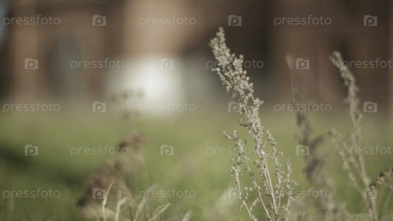 Закройте фон кирпичом и поле зеленой травы. Мягкий размытый фокус Зеленая трава и фона здания с селективной фокусировкой. Дикие цветы на фоне зданий