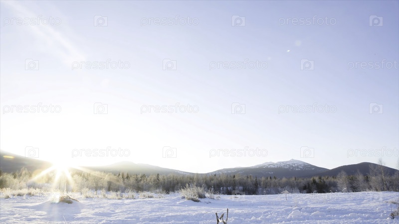 Фантастический вечерний пейзаж под ярким солнечным светом. Драматическая зимняя сцена. Мир красоты. Мягкий размытый фокус Возникновение Солнца в заснеженных горах. временный лапс