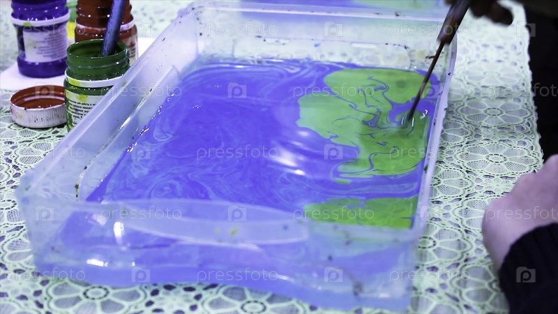 Зеленый чернила краски брызгает на голубую воду. Краска капает по воде. Ребенок учится рисовать водяную краску