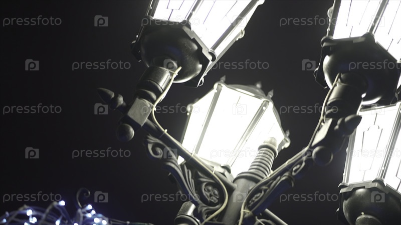 Большой план великолепного старого фонаря, который светит ночью. уличные огни закрыты снизу в центре города. зеленые стрелы освещают темноту ночи Мягкий размытый фокус