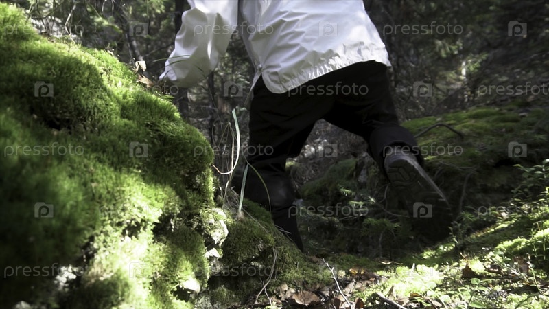 Близко к человеку, идущему по лесу и большим камням, покрытым мхом. задний вид человека в черных сапогах, пытающегося пройти через валуны в лесу