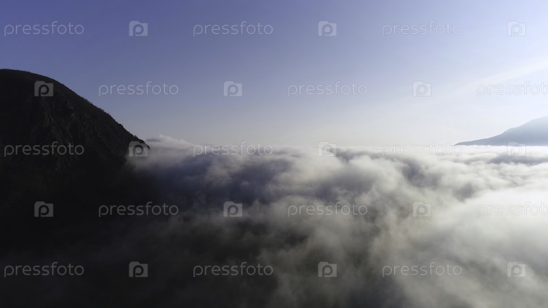 Красивый восход солнца над облаками, вид с вершины горы.Воздух для медленного движения густых облаков против синего чистого неба и яркого солнца