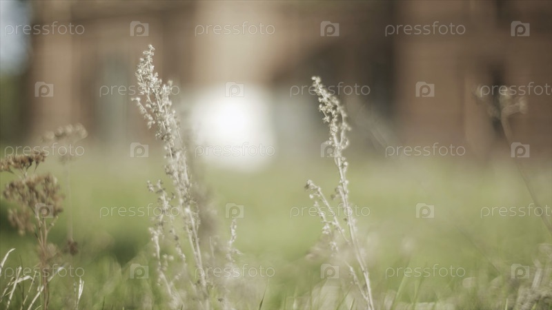 Закройте фон кирпичом и поле зелёной травы. видео. зеленая трава и фоновый фонд здания с селективным фокусом. дикие цветы на заднем плане зданий