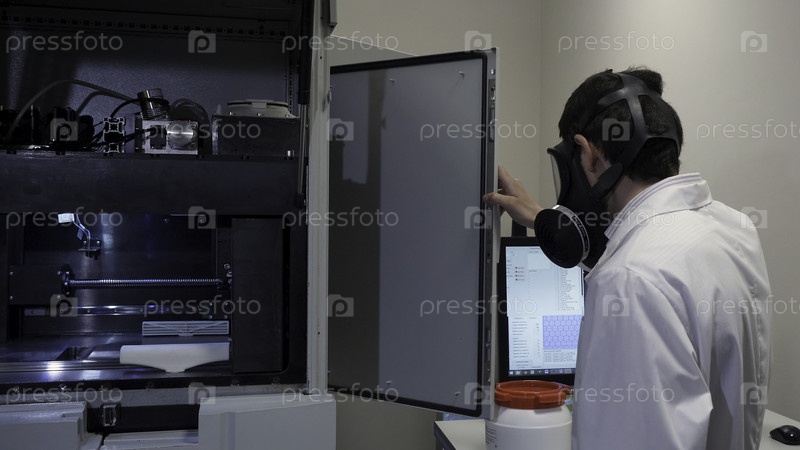 Молодой инженер в лаборатории корректирует компоненты 3D-принтера, наблюдает студент. Студенты-инженеры работают в лаборатории, студентка использует 3D-принтер на заднем плане