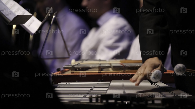 Ксилофон, концепция музыки и хроматический инструмент - крупный план на деревянных прутках с четырьмя молотами в руках человека, исполнитель в черном платье, глокэнспир, оркестровый концерт, музыкальное искусство