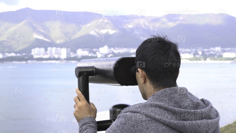 Мужчина, смотрящий через бинокль из монет на фантастический вид на горы и море.Мужской турист смотрит на прибрежный город с помощью бинокля из монет