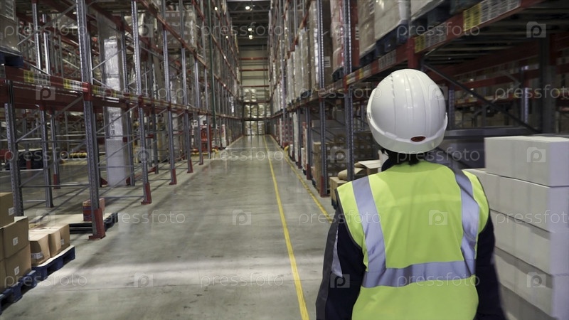 Портрет управляющего складом и работника с тяжелой шляпой, делающих инвентаризацию на складе, смотрящие на высокие полки товаров