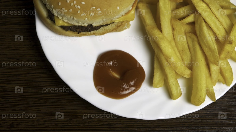 Свежий домашний гамбургер с черными семенами кунжута в белой тарелке с картофелем фри, подаваемый со кетчупным соусом в стеклянной банке на серой деревянной поверхности. чизбургер с картофелями фри на белом блюде. Погружение картофеля фри в кетчуп с сыром