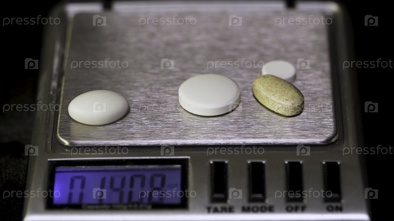 Электронные весы с планшетом на черном фоне. Лабораторные весы. Таблетки и медицинское здравоохранение, близко. Серые таблетки на электронных весах