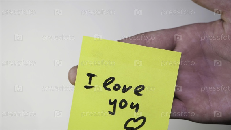 Обратите внимание, я люблю вас. Чистая желтая наклеенная записка со словами 'Я тебя люблю' на доске объявлений. Я люблю тебя на белом фоне. Рука мужчины поместила белую жёлтую наклейку, изолированную от белого фона