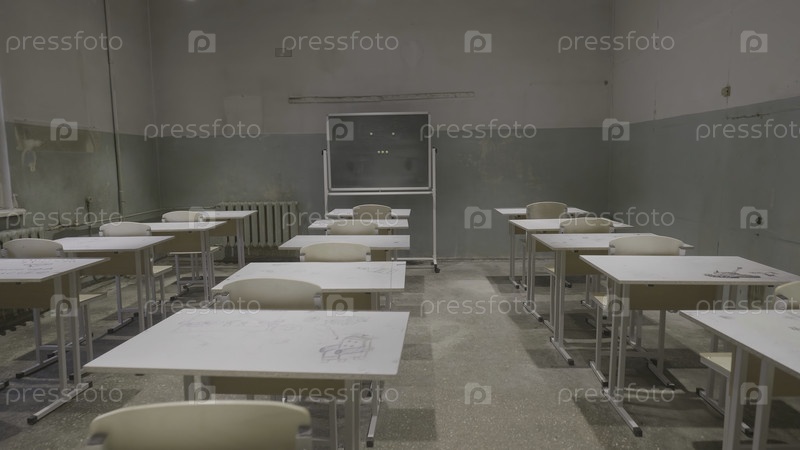 Пустой класс с деревянными столами, бело-зелеными досками в школе. пустый класс. заброшенный школьный класс со школьными партами и доской