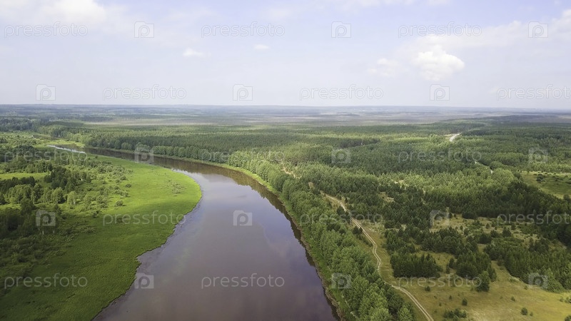 Летний пейзаж с лесом, зелеными полями и широкой рекой в солнечный день