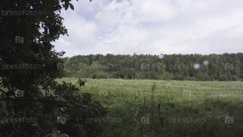 Летний природный ландшафт с зелеными деревьями и травой после дождя утром на фоне голубого облачного неба