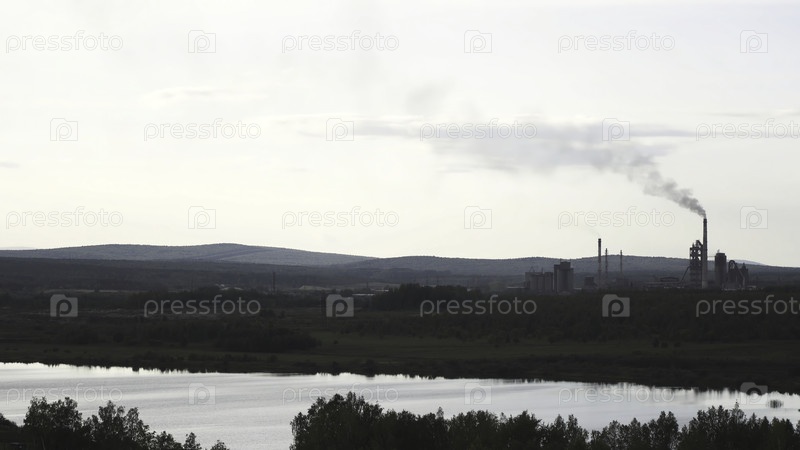 Природный ландшафт реки, зеленый лес, горы и старая фабрика с дымящимся дымоходом. резервные кадры. загрязнение воздуха и дым от завода на облачном небе