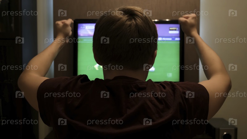 Спорт, счастье и концепция людей, человек, который смотрит спорт по телевизору и поддерживает команду дома. Концепция. Задний вид человека, сидящего и смотрящего футбольный матч, поднимающего кулаки и хлопающего в ладоши