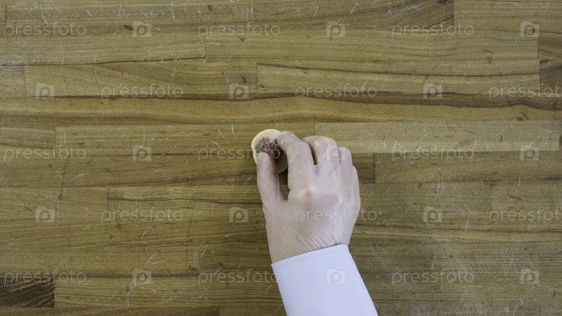 Сверху рук делают пельмени на деревянном столе. вид свысока изготовления пельменей. пельмени, мука, луки, булавка, на деревянном столе