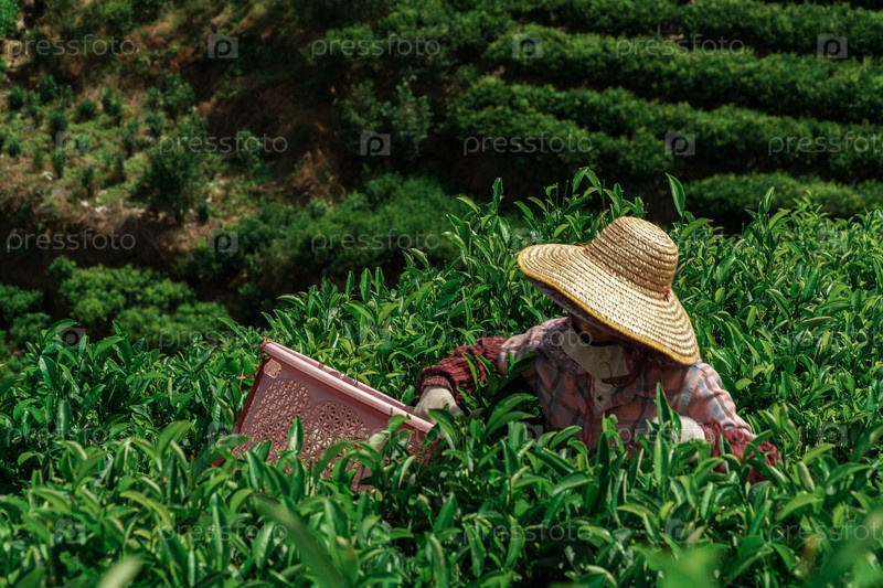 Специальный работник тщательно собирает свежие чайные листья в живописном пышном ландшафте под теплым солнцем
