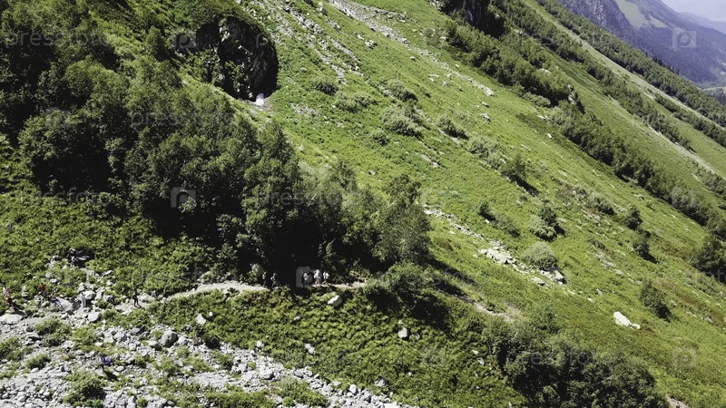 Воздушная стрельба из летающего беспилотника группой пешеходов, идущей по горной тропе. Группа туристов, путешествующих через горную долину. Пешеходная экскурсия в горы. Група путешественников, ходящих по горной дорожке с воздушным видом