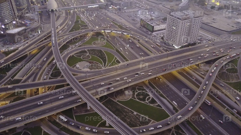 Вид с воздуха на пересечение трассы с движением транспорта в Дубае, ОАЭ, при закате солнца. Знаменитая Шейх-Зайедская дорога в центре Дубая. Вид на транспорт и вождение со крыши