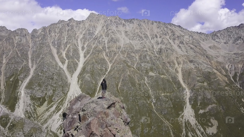 Человек, стоящий на скале, снимает горный пейзаж. Клип. Путешественник делает захватывающую панораму гор по телефону. Маленький человек против величественных гор