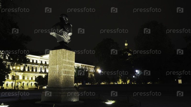 Памятник с бюстом в ночном парке. Продолжайте. Обратный вид бюста в парке на фоне исторических зданий освещается ночью. Исторический парк со памятниками великих людей