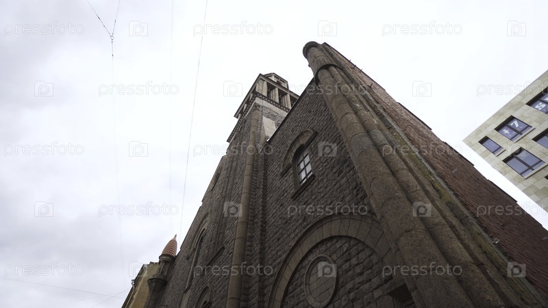 Нижний вид на католическую церковь сделан из красного кирпича. Идите вперед. Старый модернистский храм стоит против облачного неба. Историческая достопримечательность города Санкт-Петербурга