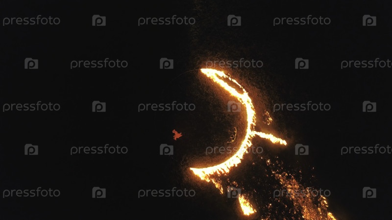 Ведьма в огненном круге. Сток. Вид на обряд ведьмы под открытым небом. Женщина в красном платье выполняет мужской очаровательный ритуал, разжигая круг огня на поле. Понятие колдовства