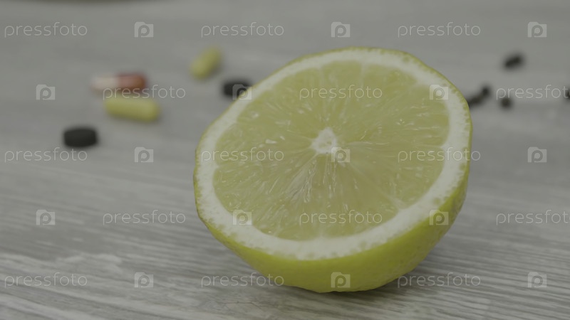 Половина спелого желтого лимона лежит на столе