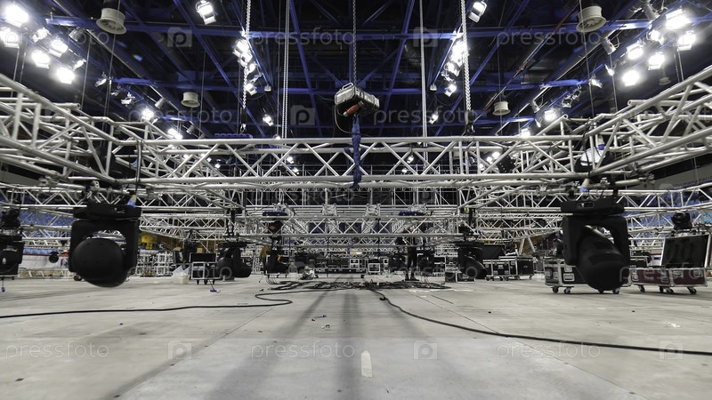 Установка оборудования для спектаклей или концертов. Резервное видео. Металлическая конструкция, подготовка профессионального освещения к мероприятию, промышленный опыт