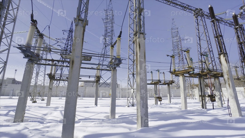 Вид на электростанцию зимой.Электростанция в поле в солнечный зимний день.Прекрасная станция с множеством столбов и кабельных проводников