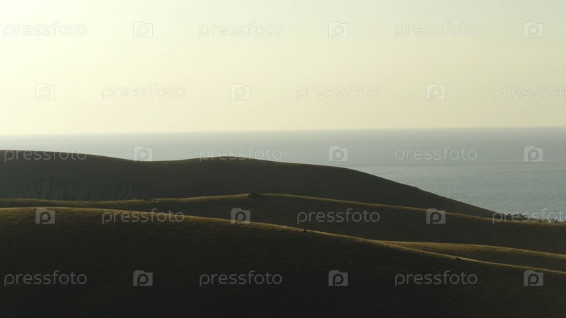 Вид с воздуха на высокие зеленые холмы и голубое море на фоне вечернего неба летом