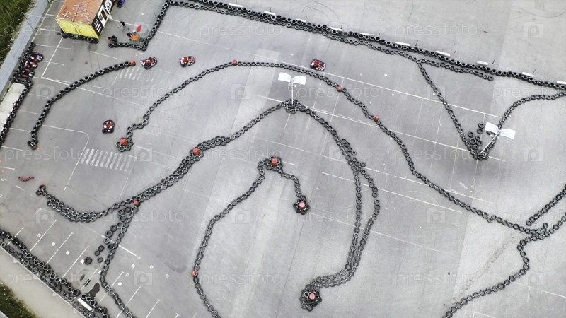Гонщики тренируются или соревнуются на картинговой трассе в защитной форме и шлеме, с воздушным видом