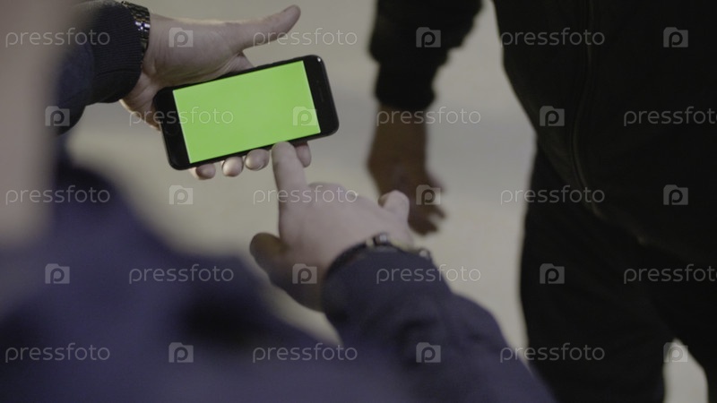 Мужчина показывает другу новое приложение на своем мобильном телефоне - телефон с зеленым экраном