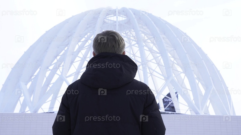 Вид мужчины, смотрящего на здание купола.СМИ.Вид сзади человека с учетом архитектурной структуры открытого купола против неба