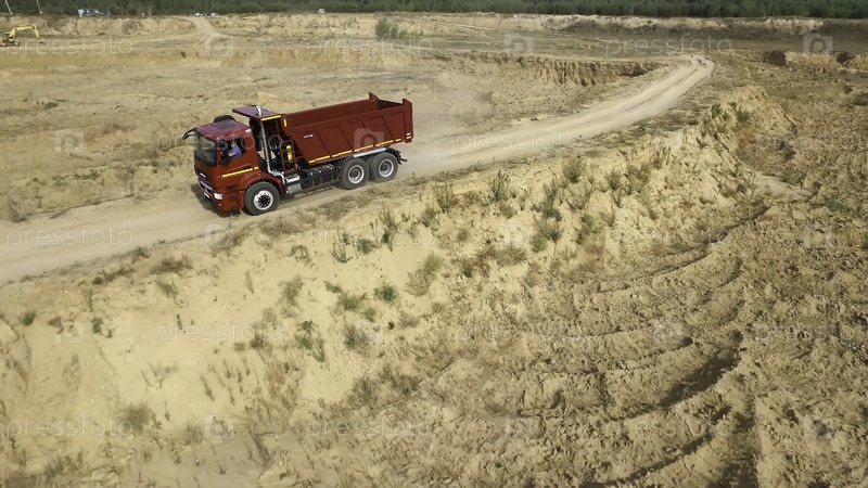 Дампер находится на сельской дороге.Сцена.Вид поездок грузовиков, оставляющих облака пыли на грунтовой дороге в деревне среди карьеры экскаватора