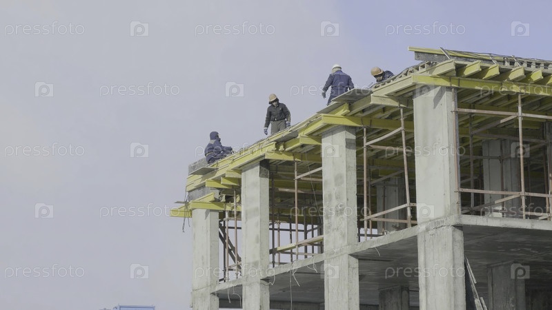 Рабочие на строительной площадке работают против голубого неба.Работники на стройплощадке многоквартирного дома