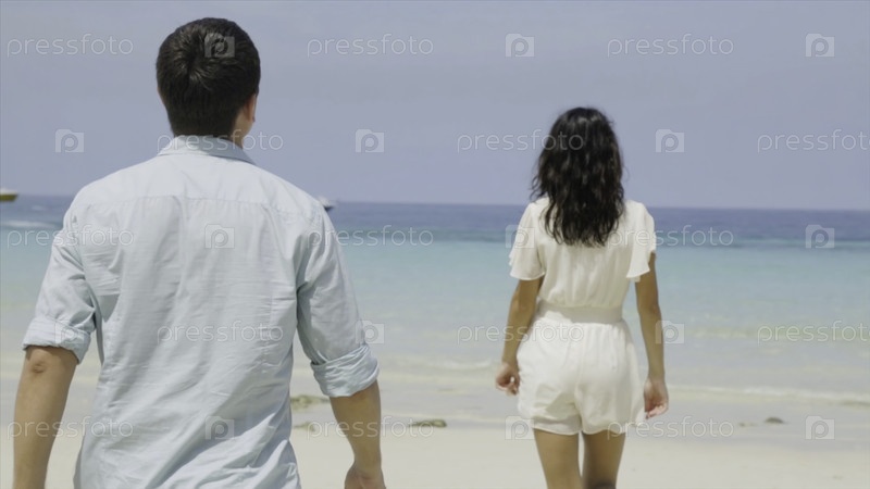 Милая пара в белой одежде идет на пляж. Пара подростков бегает и флиртует на пляже у воды. Женщина, идущая по романтическому медовому пляжному отдыху, держит руку парня, следует за ней, вид сзади. Молодая женщина держатся за руки на красавице