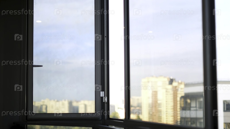 Закройте открытое окно с голубым облачным небом и высотными зданиями снаружи. Концепция. Утром пустой балкон жилого дома