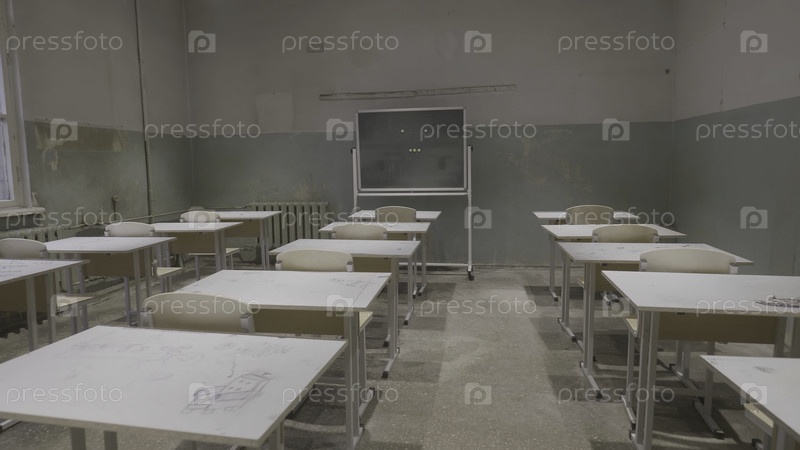 Пустой класс с деревянными столами, бело-зелеными досками в школе. пустый класс. заброшенный школьный класс со школьными партами и доской