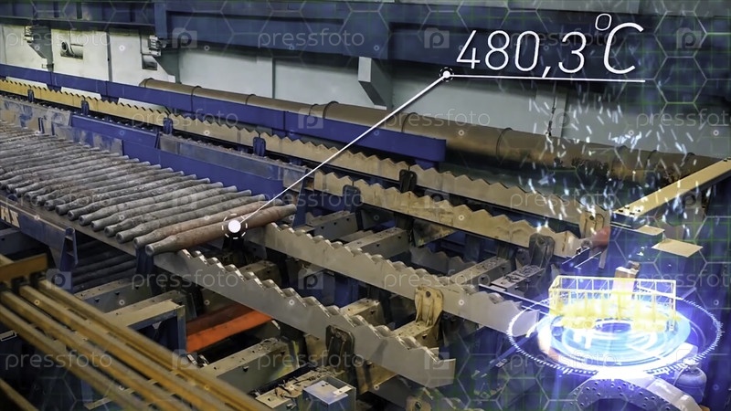 Производство рельсов для поездов и грузовых вагонов, вагонов. Железнодорожный завод. Стальной круглый стержень - это материал железных металлических железнодорожных линий для промышленного строительства на складе. Большая пресса. Анимация HD