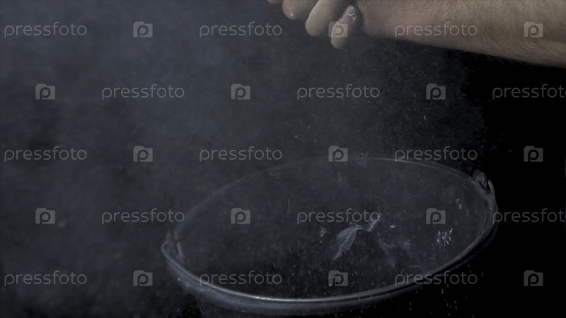 Массаж мускулистого мужчины, готового к тренировке. Мужчина-пауэрлифтер в тальке и спортивных браслетах готовится к прессе. Руки в меле