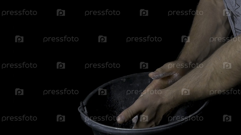 Массаж мускулистого мужчины, готового к тренировкам. Мужчина-пауэрлифтер в тальке и спортивных браслетах готовится к пресс-станции. Руки в меле. Мужская рука пауэрлифтера в талке