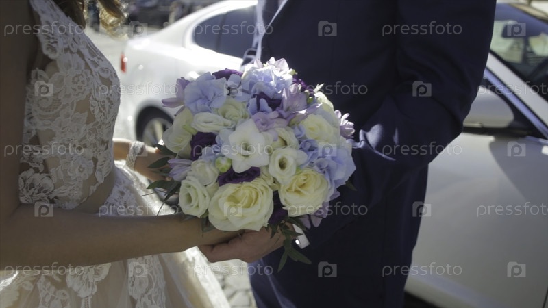 Жених и невеста держат красочный свадебный букет. Концепция брака. Красивая молодая супружеская пара в природе. Свадебная пара со стильным букетом HD